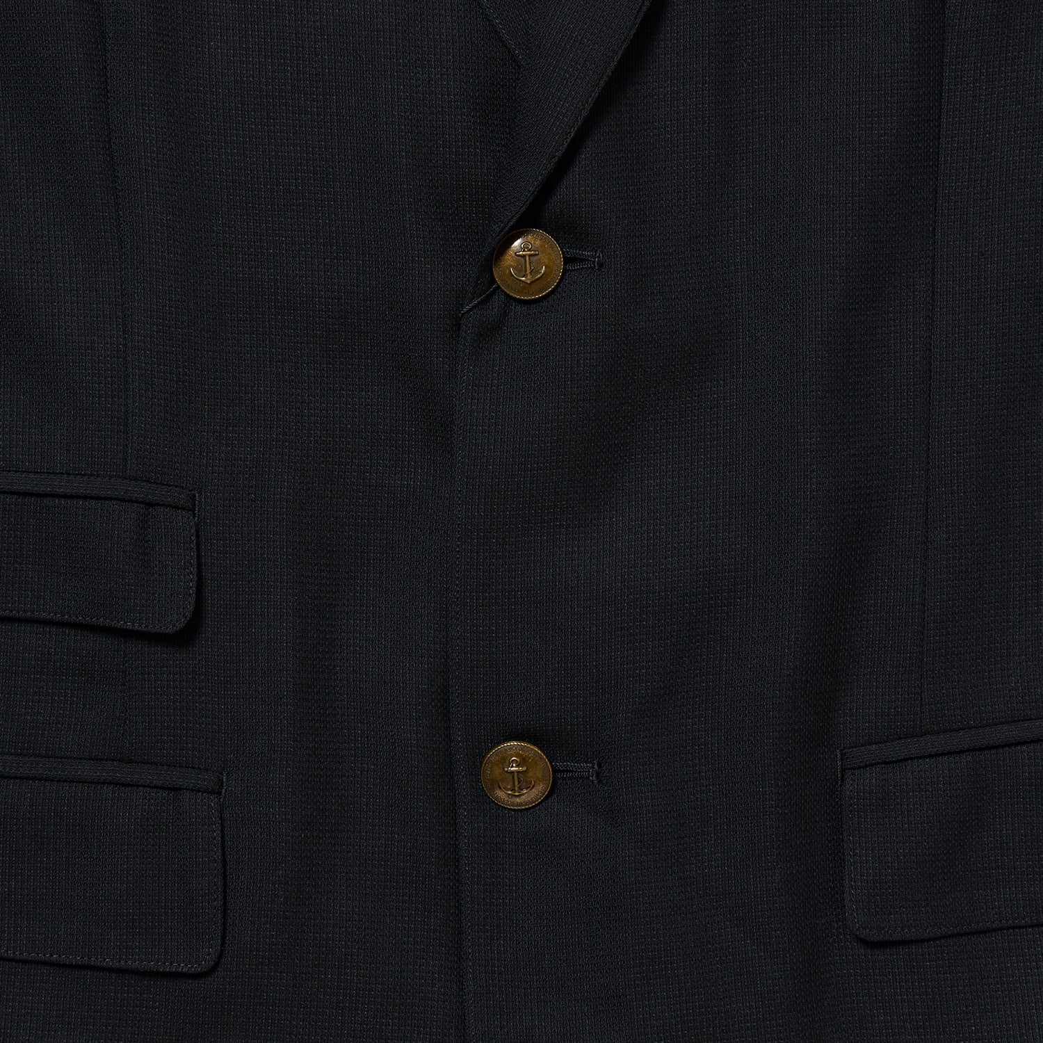 春夏用の紺ブレ、ネイビーセットアップをイメージして、熱帯素材と言えばのヴィンテージ、英40年代のパナマクロスをスーパー140'Sウールとシルクで作ってみました。ブッシュジャケットやグルカパンツなどの夏アイテムにピッタリなメッシュ調のサラサラタッチとシルクのオチ感が気持ちの良い1着です。