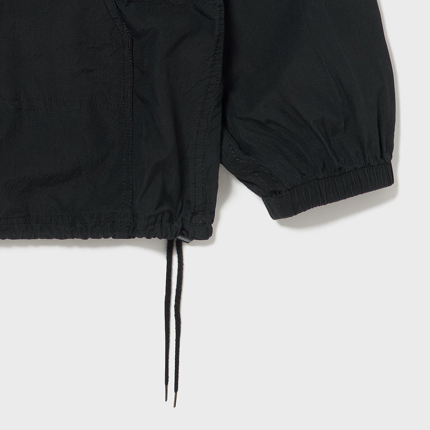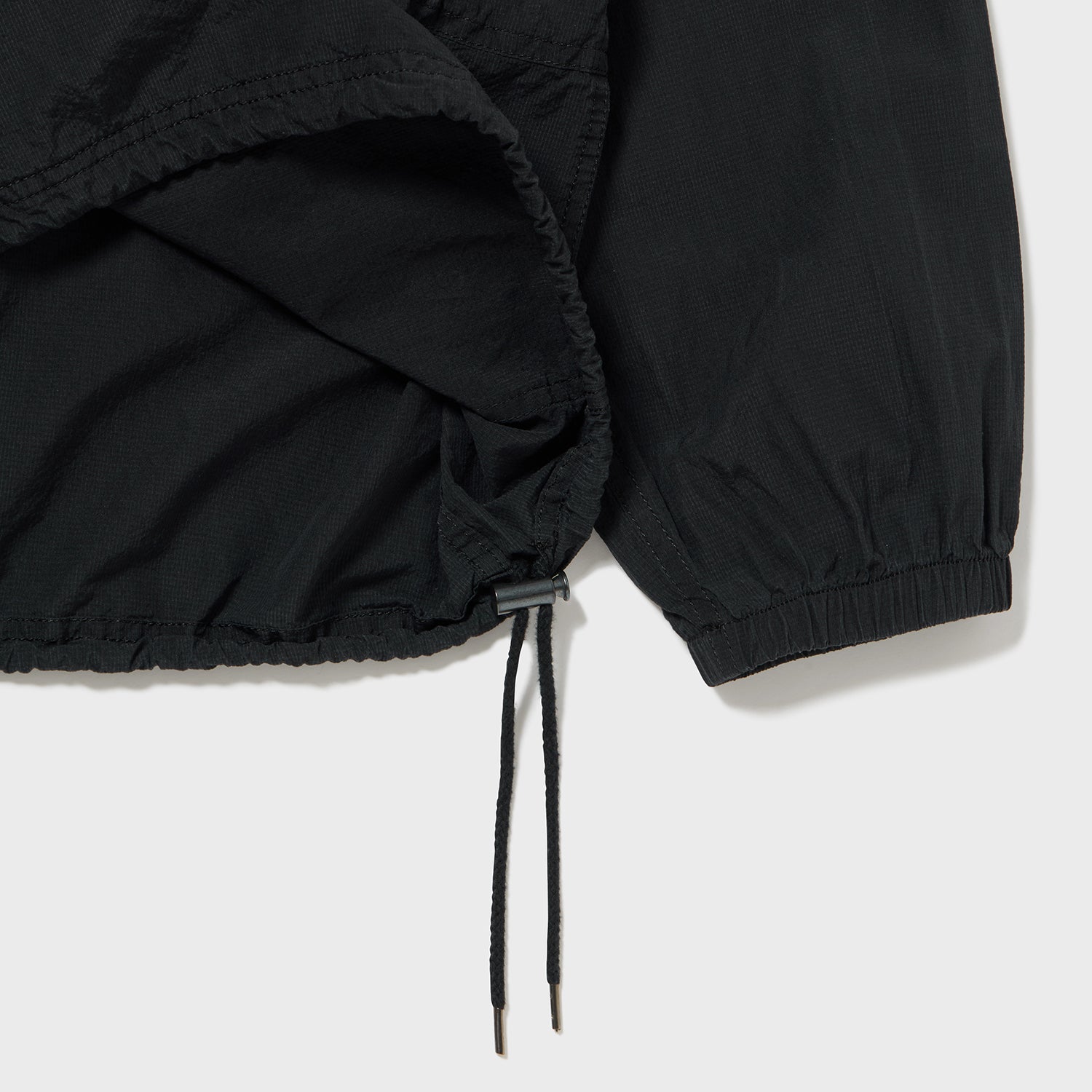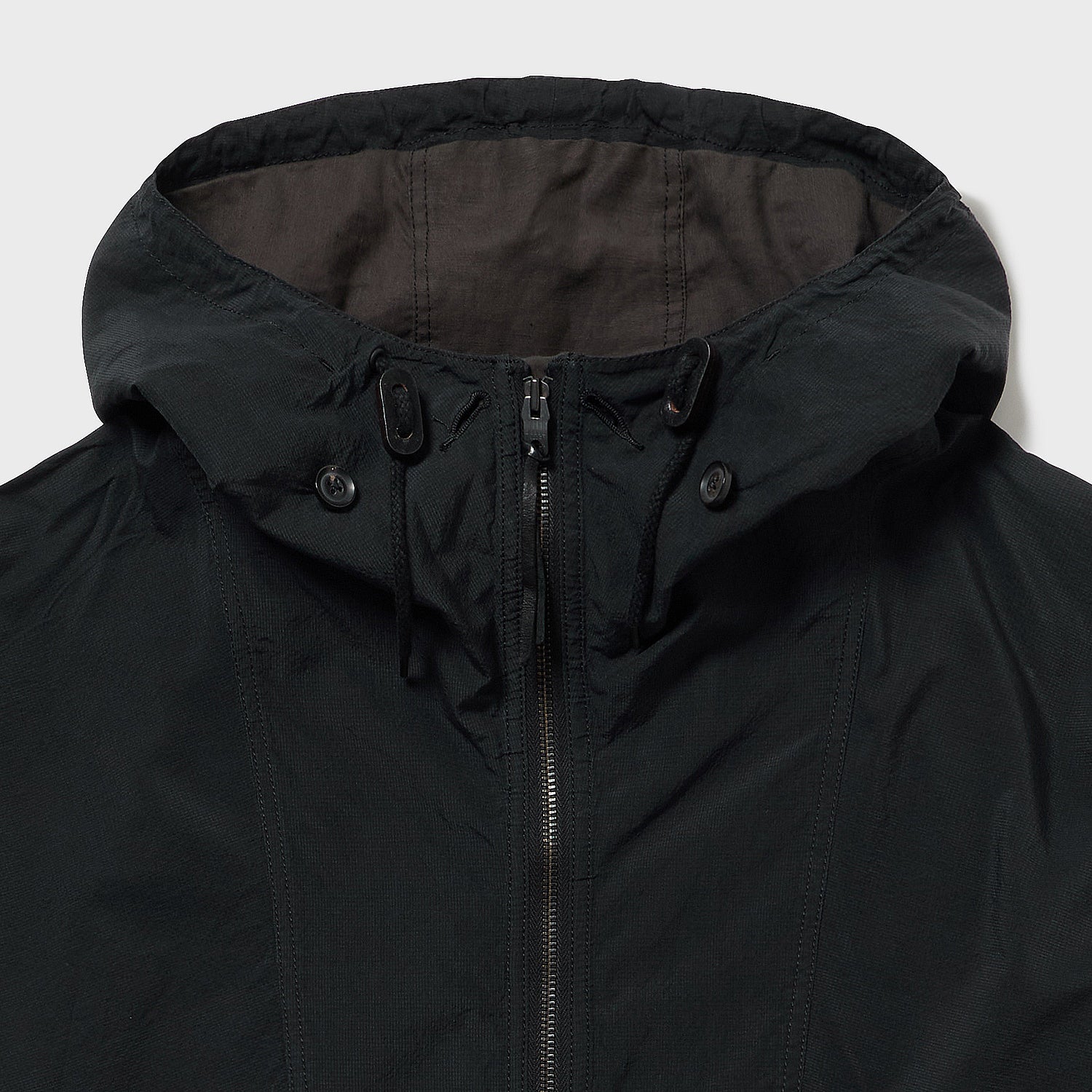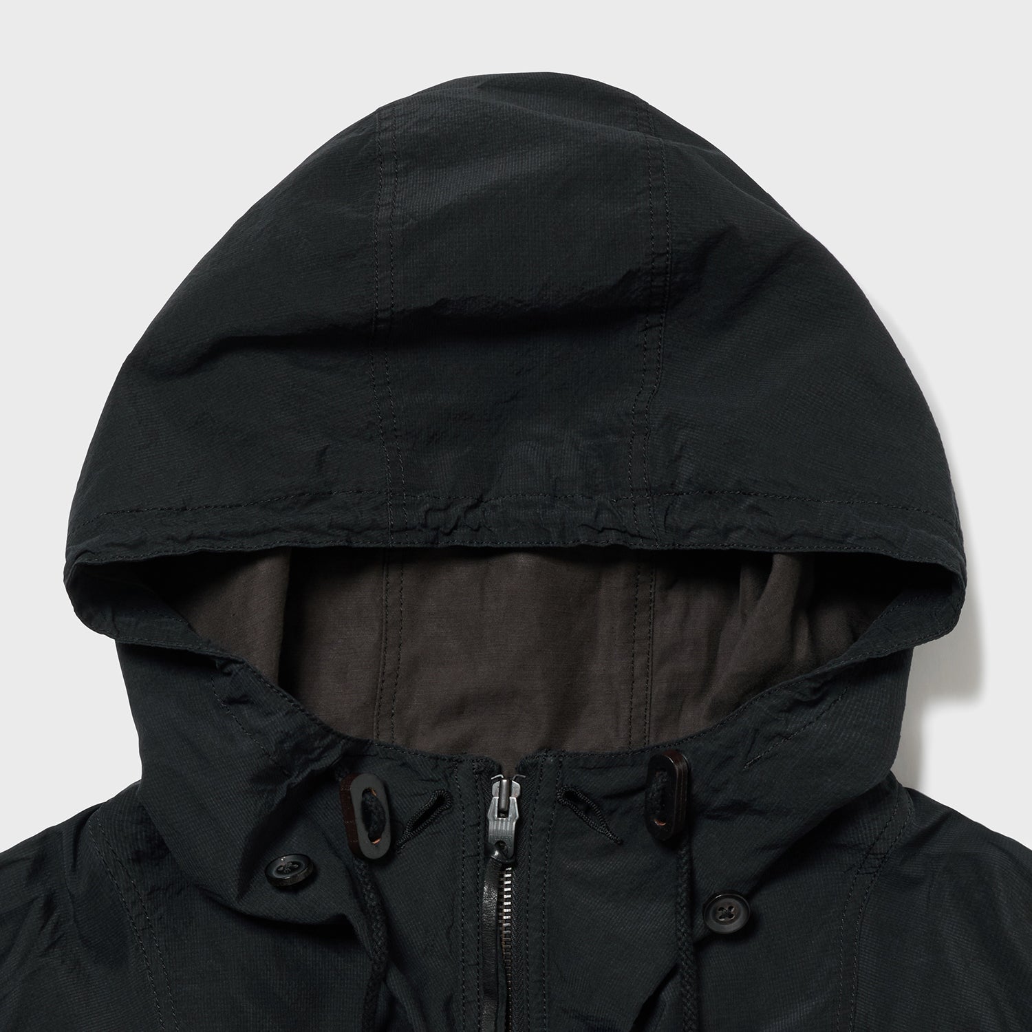 極薄ながらハリとコシがあるため、着用時にフード周りを立てたり寝かしたりと、自在に形作ることができます。
