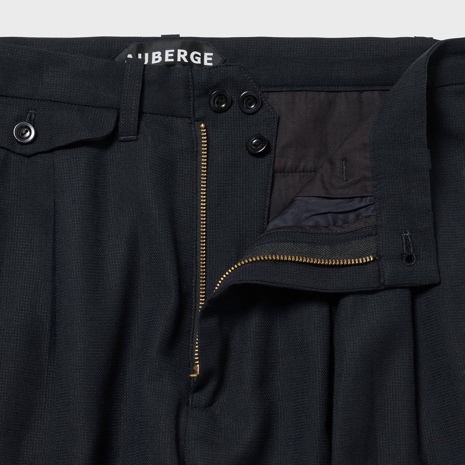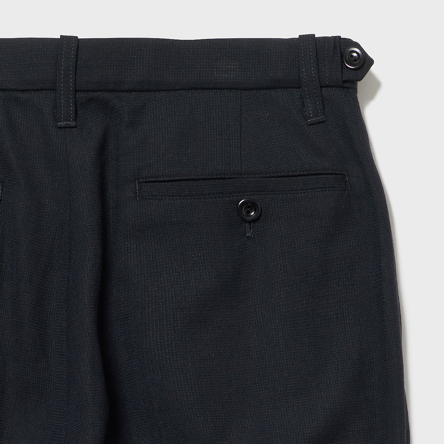 イギリスCC41時代のスラックスから後ろベルトにサイズアジャストのゴムが入る極めて珍しいスラックスを入手、採用した。これにより1サイズ上下にサイズを変えることが出来、戦時中の物の少ない時代のアイデアと思います。当時の流行だったのか、ほぼ何も入らないのに付いているビッグフラップなコインポケットも、もちろん装備。