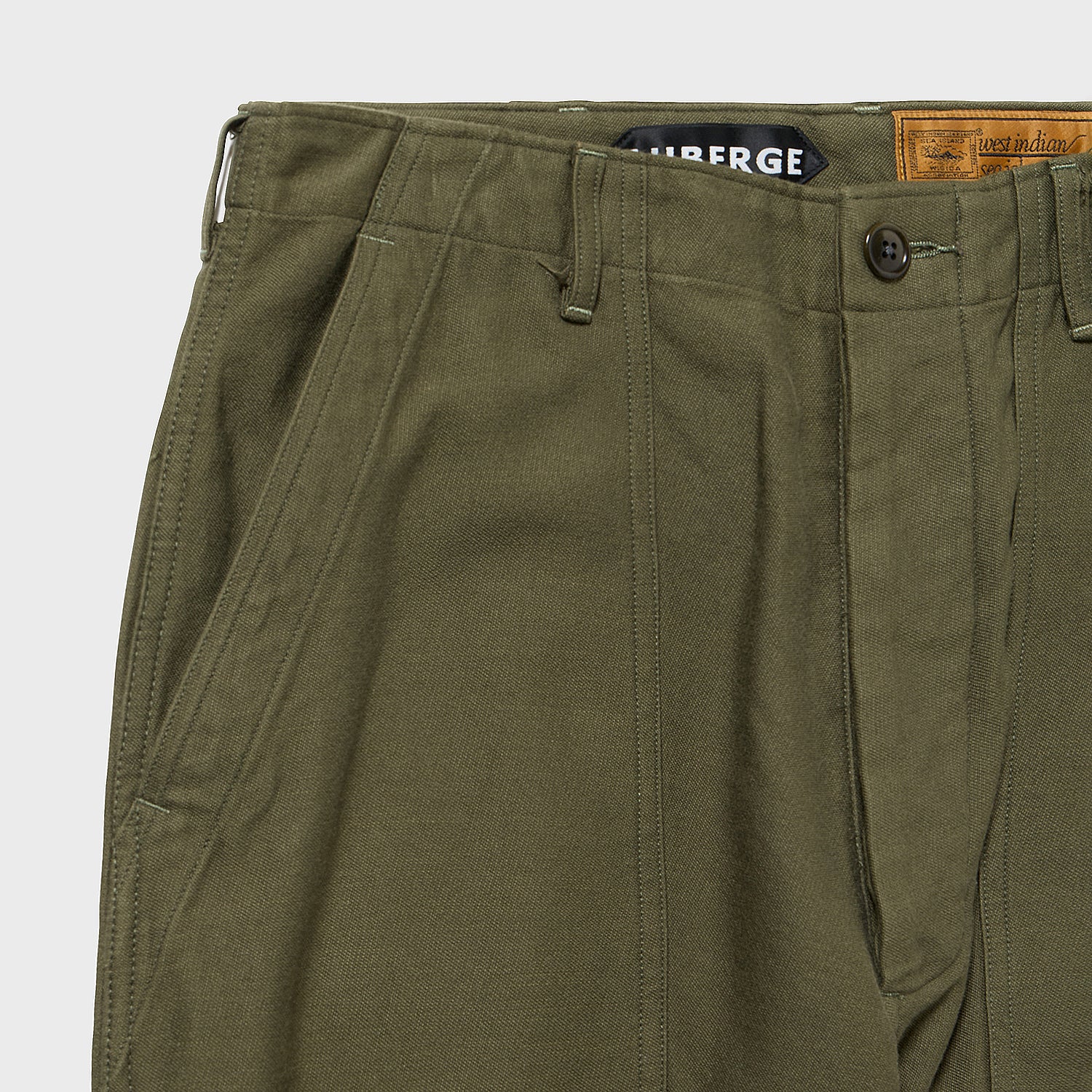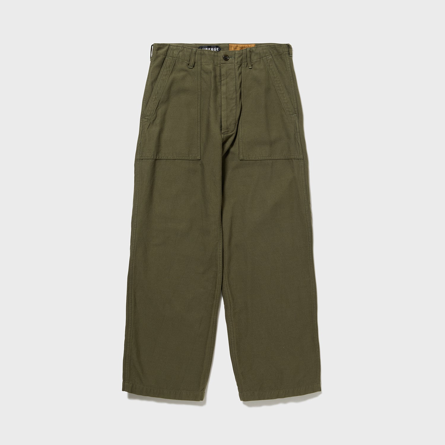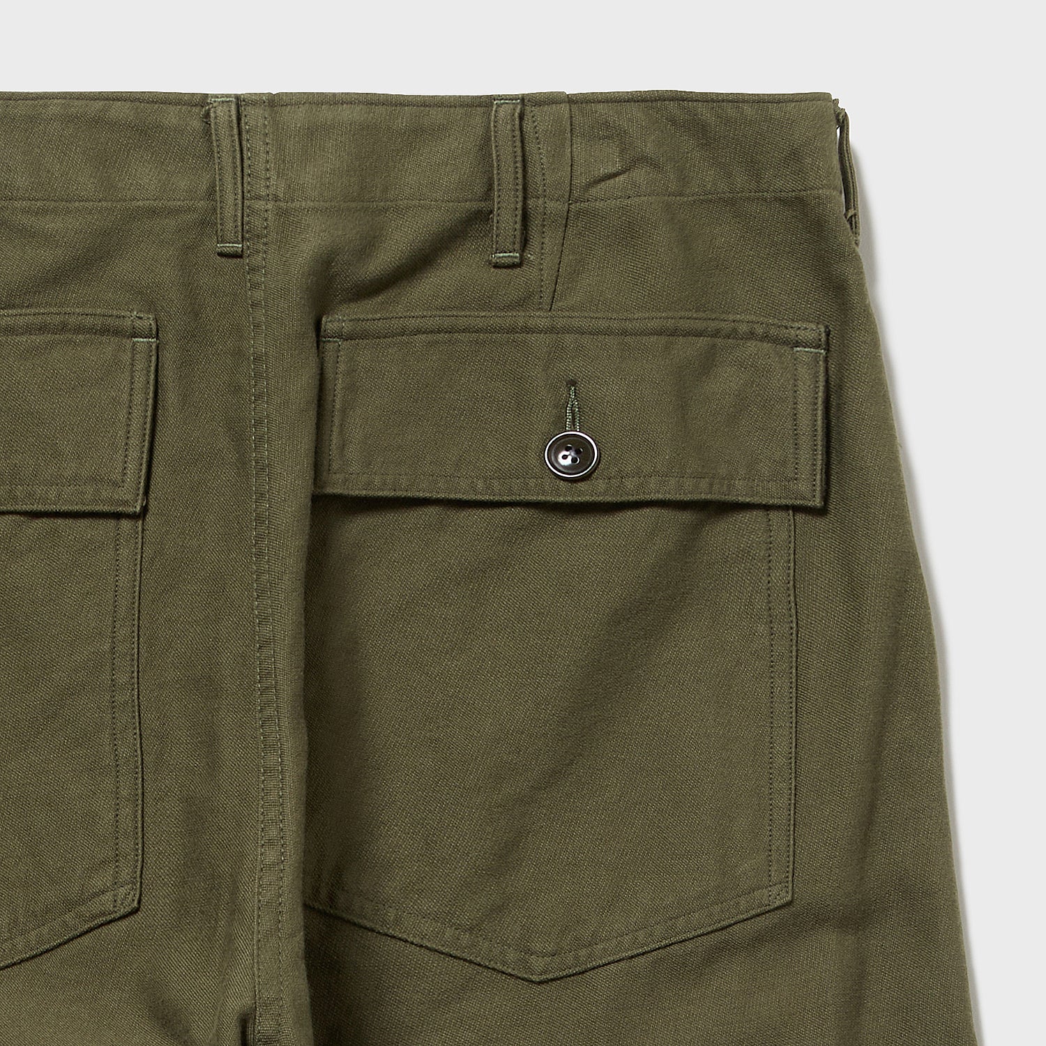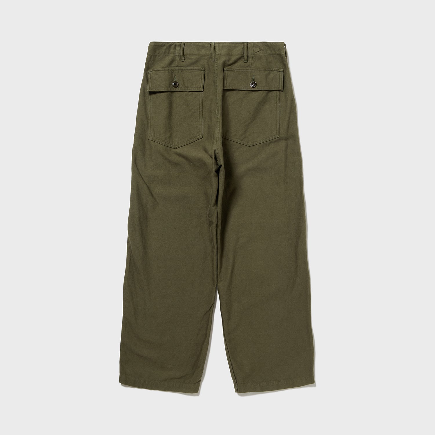 デザイン・・・いわゆる米軍のベイカーパンツは深めの股上から腰回りがノータックでジャストフィットするレディーススラックスを思わせる型紙で腰上部に張り付くようなシルエットが特徴です。これをそのまま写しで作るより、今回は好評を博したM41チノ型原型に50年代製ベイカーパンツのディテールを乗せてみました。バックサテン特有のもっちり感を柔らかなカリブ海島綿の特製が相まって今までにない、履き古したようなとろみが特徴なモードアイテムとも相性の良いワイドストレートパンツが完成いたしました。