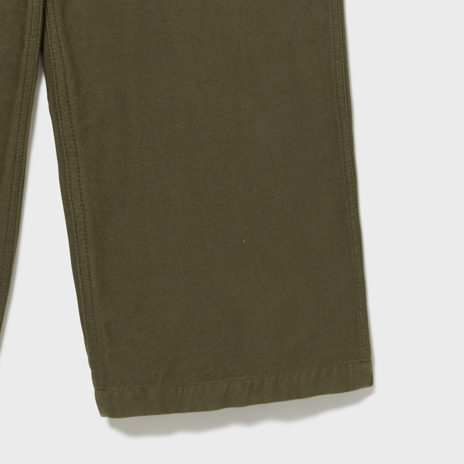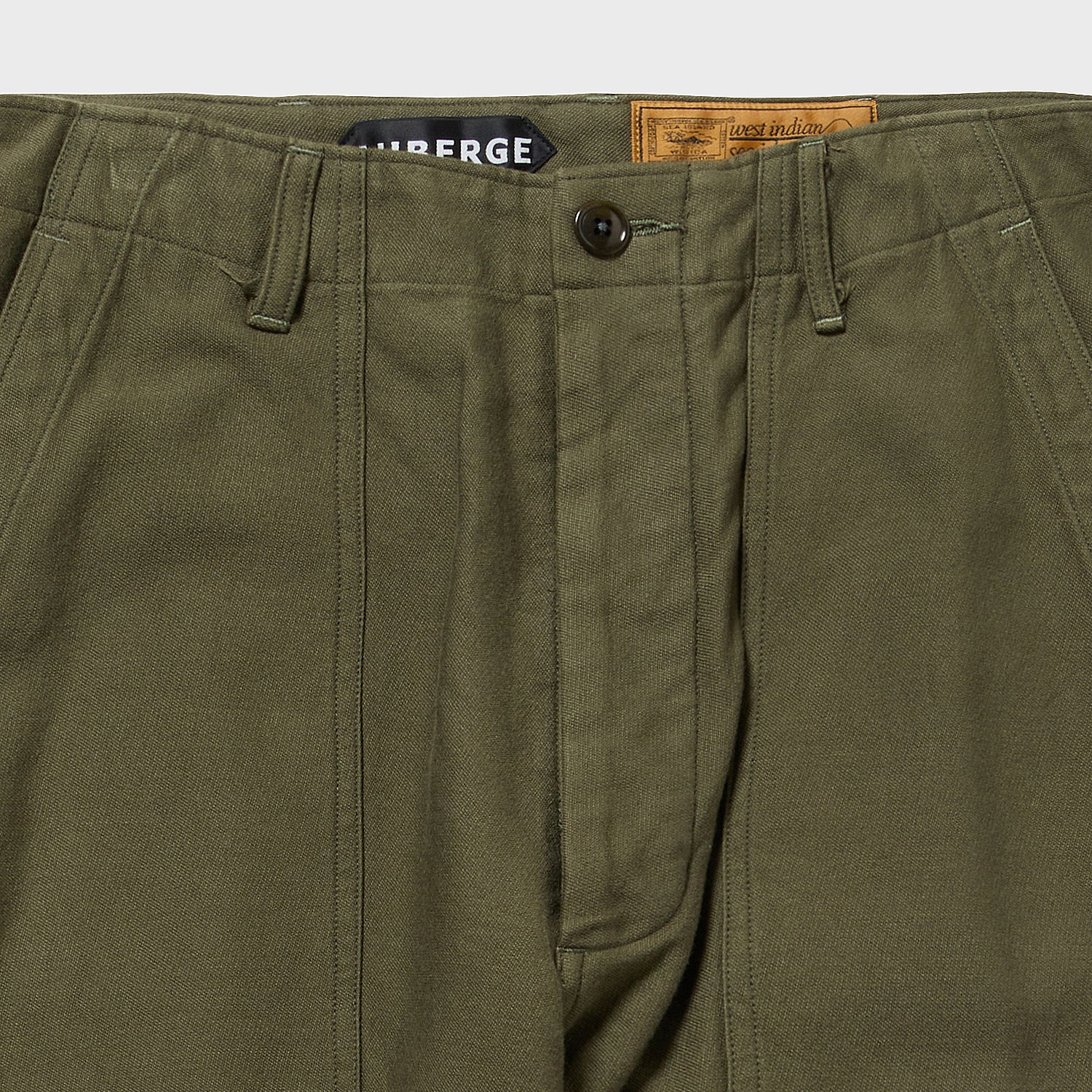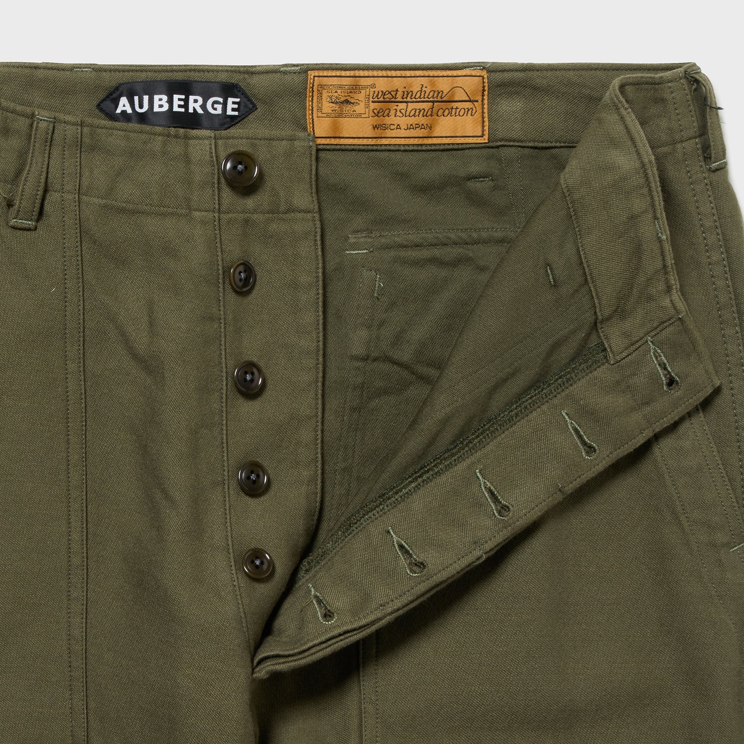 テキスタイル・・・米軍のOG-107と呼ばれる綿のバックサテンを海島綿を用いて再現した生地。元生地は比較的ラフで横方向にムラ感のある糸の走りが目立つ生地ですが、今回はもともと糸面のきれいな18/1の海島綿をさらに2本撚り合わせてより均一な糸面にした18/2の糸18/1の糸に30/1の糸を巻き付けることで凹凸のある糸面にした壁糸、2種類の糸を作り、これを一本切り替えでよこ糸に打ち込むことで最高品質の糸で粗野な生地を再現するという難題にこたえました。バックサテンはよこ糸が生地の表面を覆い、たて糸の露出がほとんどない組織ですがこのたて糸をよこ糸よりわずかに濃い色に染めることで陰影を出し立体感を強調するという仕掛けも盛り込んでいます。一見ラフな表情とは裏腹に、上品な光沢やその質感は海島綿の最上級の質感を十分に味わえる仕上がりになっています。