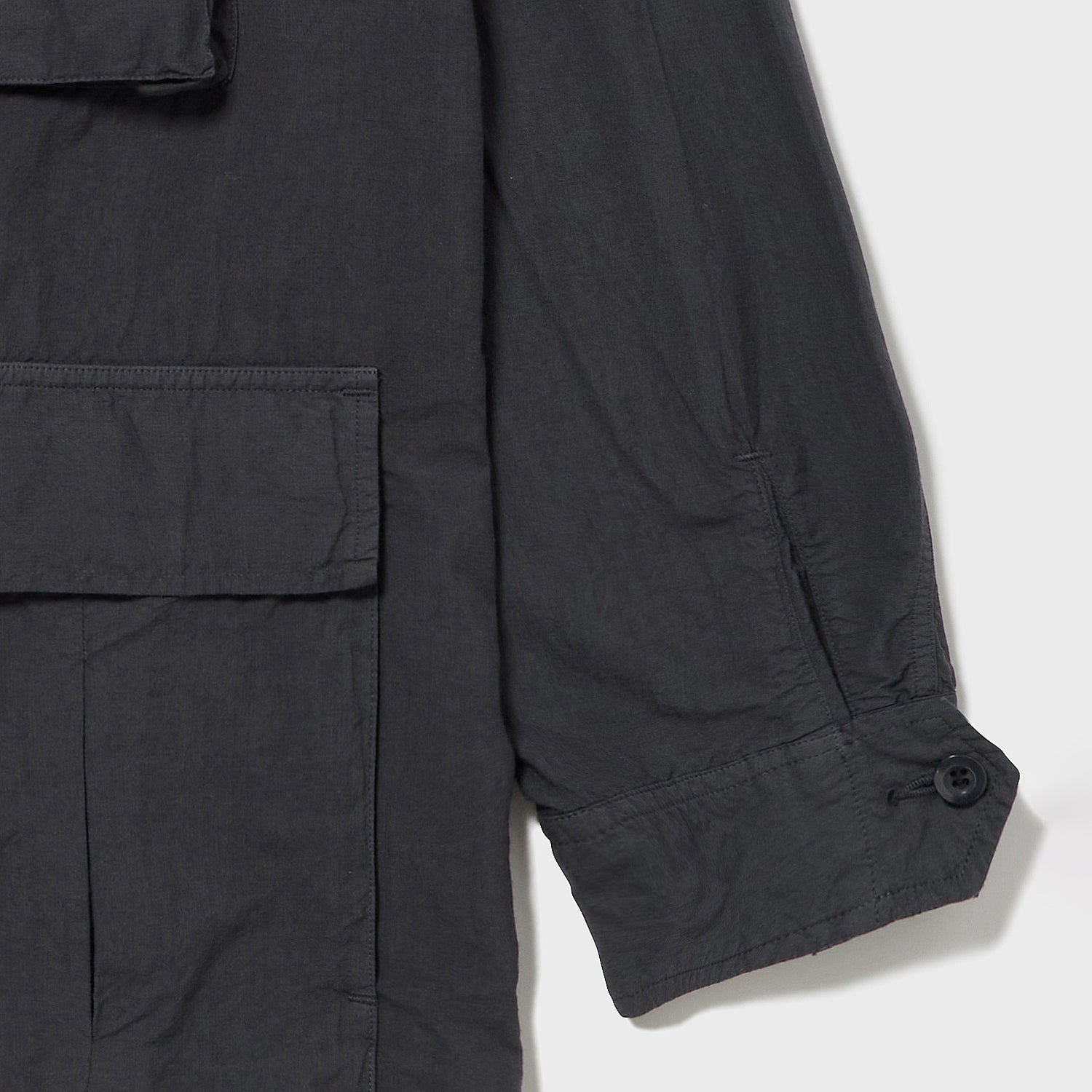 当初のイメージでは、ベトナム戦争期のジャングルファティーグがマッチすると考えましたが、輩感が強めに出るため、今回はカラー・デザインともに少しナイーブなシャツ生地で作ったライトミリタリーを目指し、80年代の海兵隊4パッチJKに仕立てました。