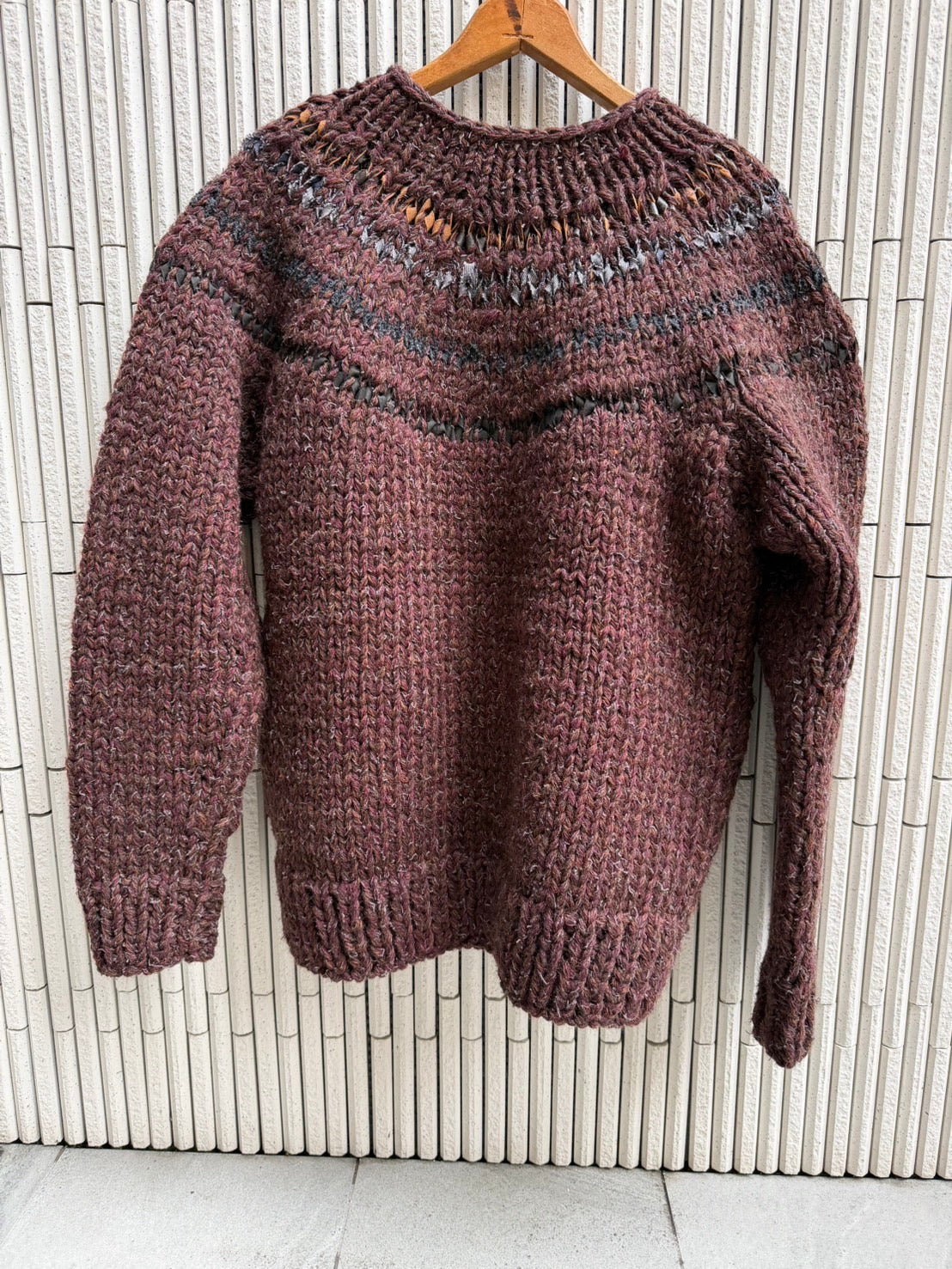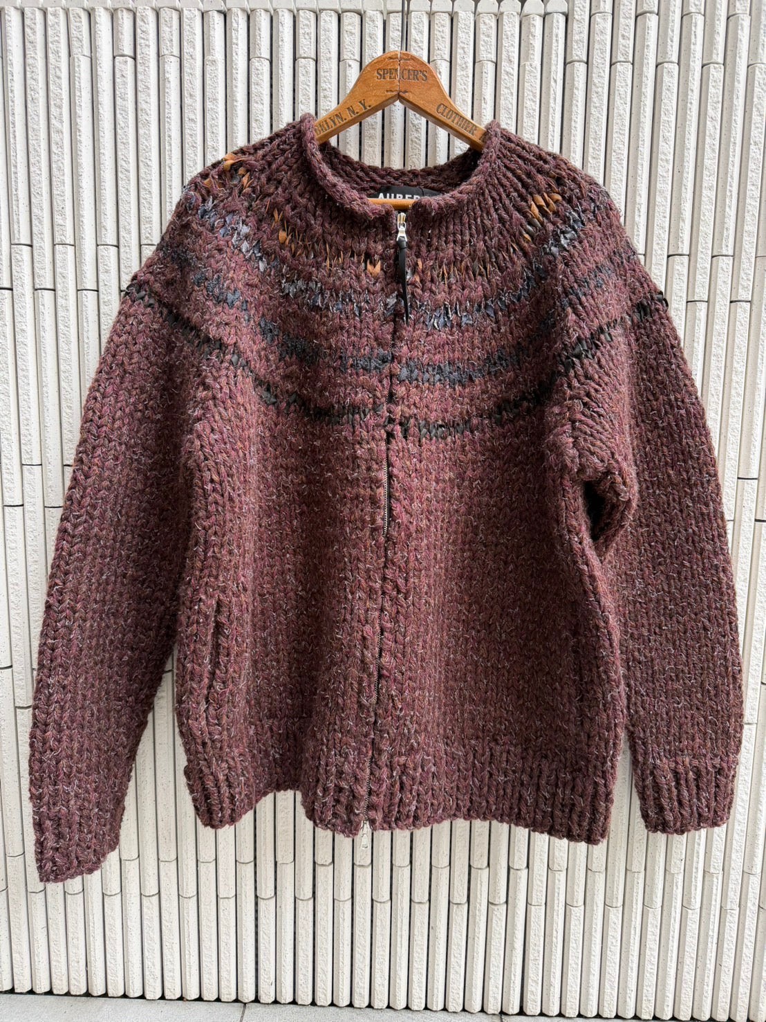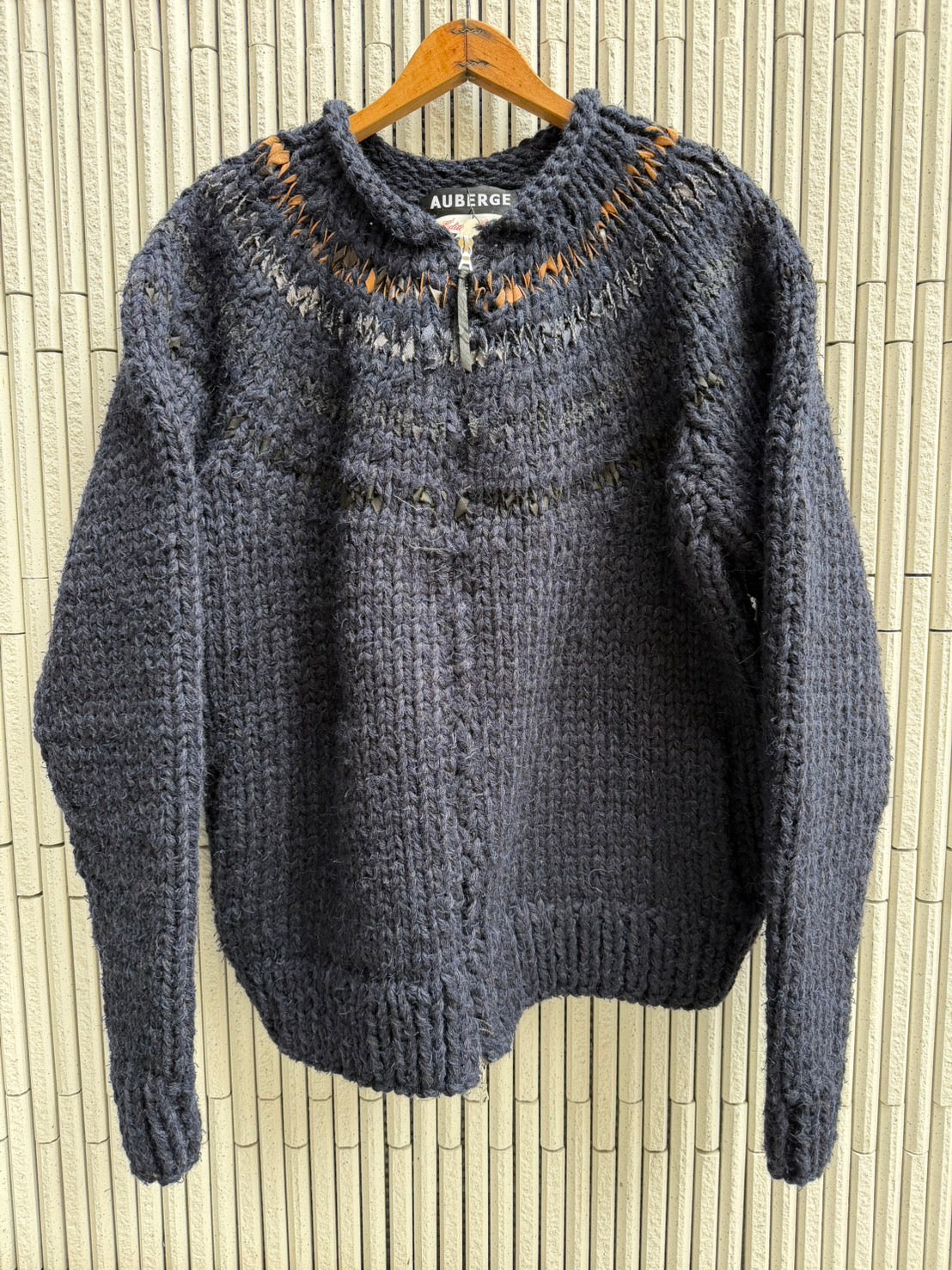 ウール、アルパカの糸をベースに今までAUBERGEが別注してきた生地を8ミリのテープ状にカットしてウールの糸と一緒に水紋のように編んでいく定番カウチン。今回はレザーと今までAUBERGEで製作した生地も入れてみました。重さも今までで一番の1.8キロです。ベースボディーに使っている糸も多種多様なカラーを混ぜて9本撚りの糸を独自で製作しています。それによって製品に深みを出しています。