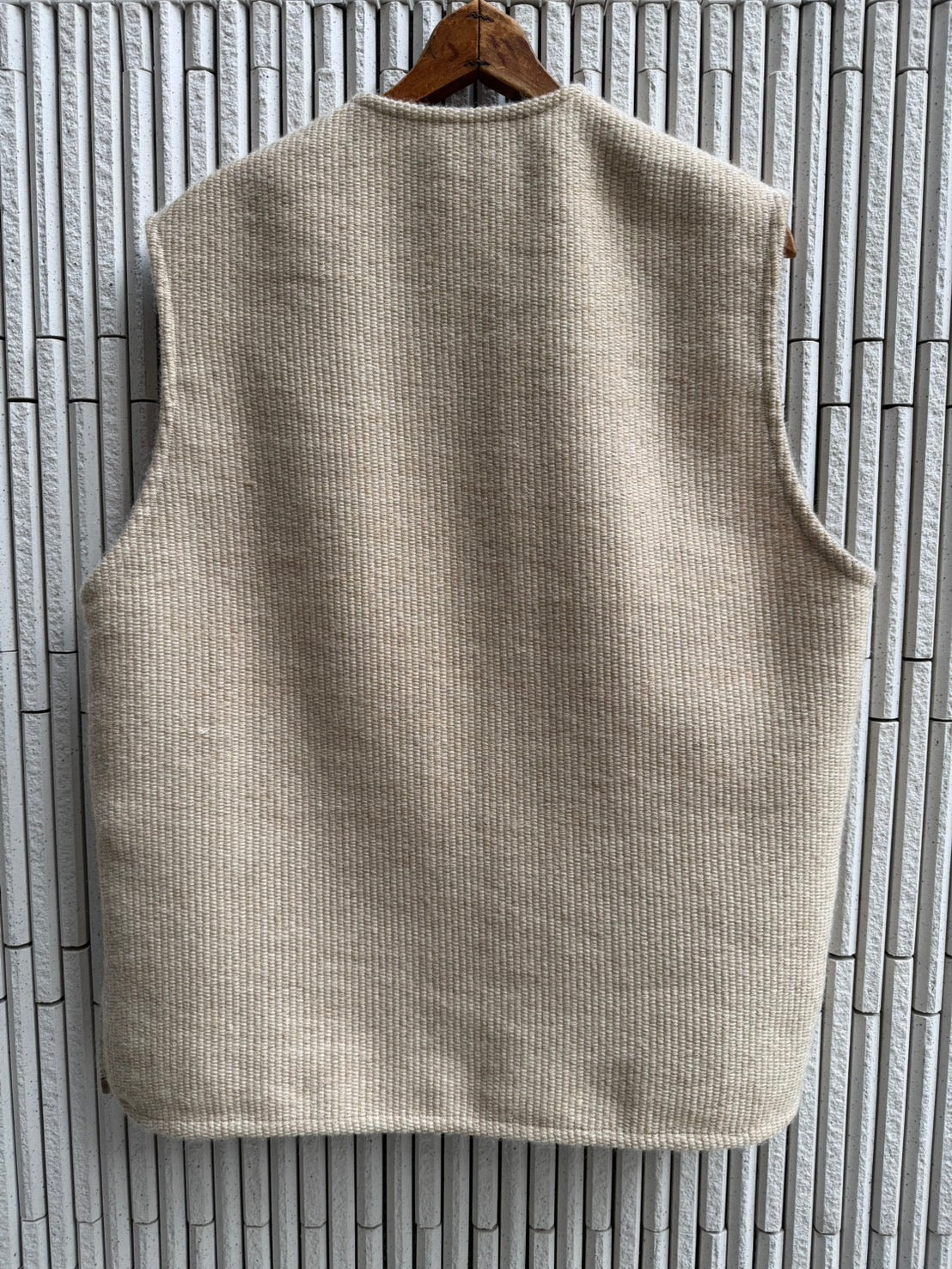 今回はチマヨベストに使用されるネイティブラグをターゲットに 経糸にはこちらも未染色の太番手のリネンの糸を使用。緯糸には上記モヘア・アルパカの糸を6本撚りにした糸を使用。この糸の間にウールの糸(こちらも未染色)を挟み込むことで、物性的な安定と密度感を高めています。実際の目付はかなり重い生地ですがその独特な風合いとハリによって体感ではそこまでの重さを感じず、たとえようのない独自の質感に仕上がっています。